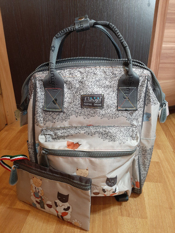 Когда увидела эту сумку-рюкзак в метро у девушки, я была от неё в восторге. По бренду нашла её в магазине и сразу купила. Сумка вместительная, к ней идёт косметичка. Прошита хорошо, швы все ровные и аккуратные. Оказалось, что в этой серии коты, много видов сумок и рюкзаков разных размеров. Теперь хочется к коллекции ещё разных сумочек с котами) В эту коллекцию с котиками я влюбилась)