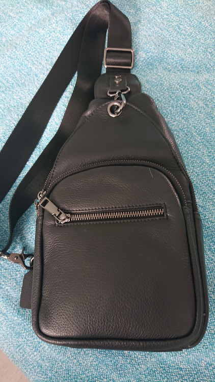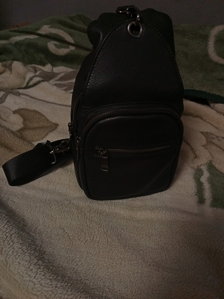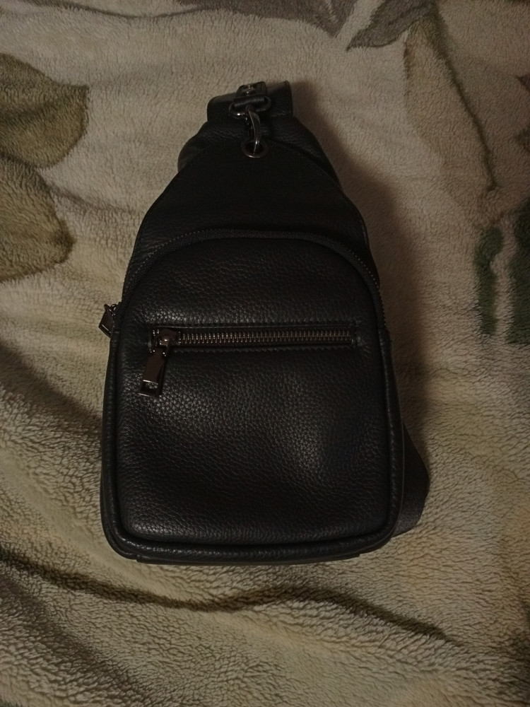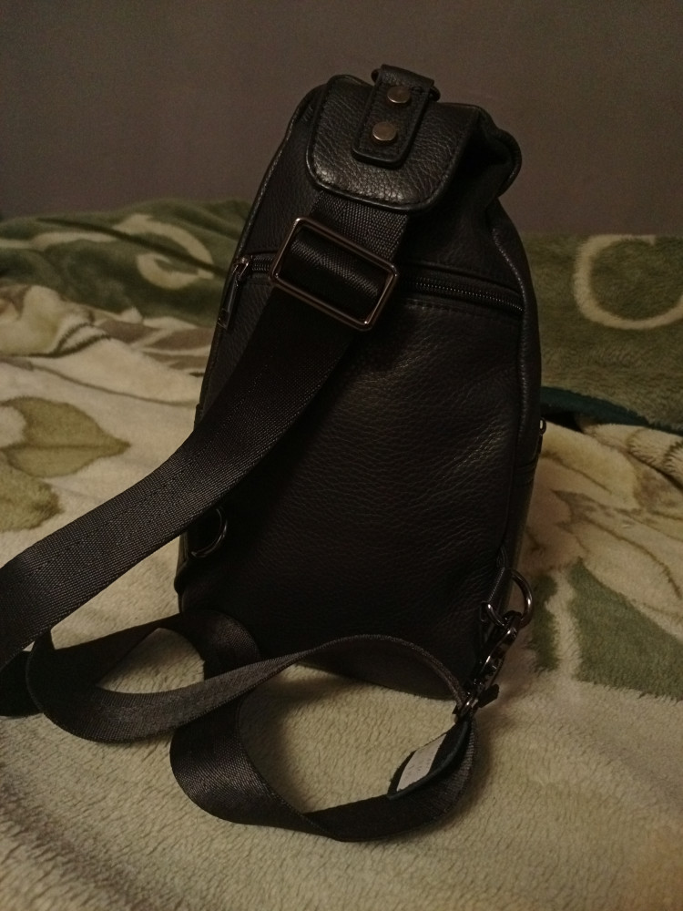 Классический рюкзак на одной лямке. Два отделения, в большом есть внутренний карман на молнии для мелочей и карман на молнии на внутренней стороне. Кожа свиная, но не плохой выделки, мягкая, без заломов. Швы ровные. Фурнитура хорошего качества, выглядит не как "дешёвка", на отделениях стоят металлические молнии. Молнии,замки, и карабин лямки темного цвета,в тон рюкзаку. Наличие карабина позволяет менять плечо, на котором висит рюкзак. В целом качество хорошее, строгий вид, без лишних вычурностей.