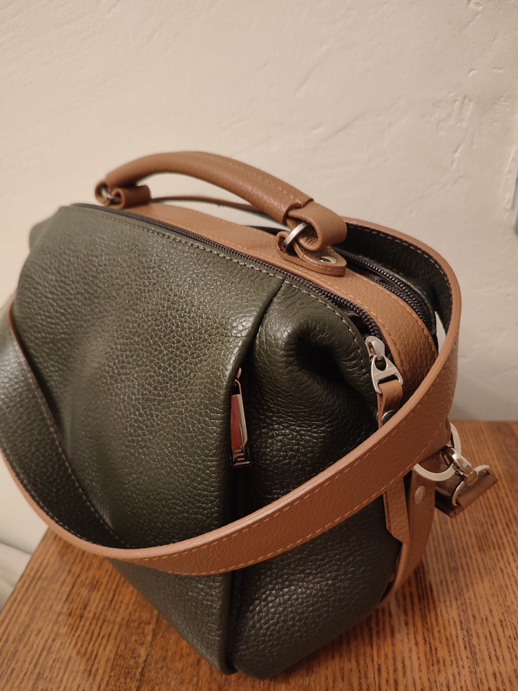 Сумка добротная и практичная. Кожа мягкая и приятная на ощупь. Очень красивое сочетание цветов: темно-зеленый (хаки) и бежевый. Довольно вместительная несмотря на небольшой размер.