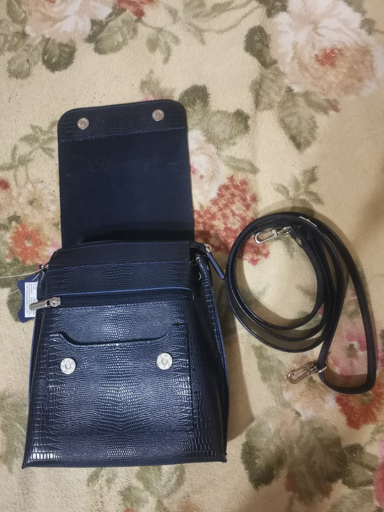 Замечательная маленькая сумочка с достаточно длинным ремешком и множеством карманов. Закрывается не только на кнопку, но и на молнию.