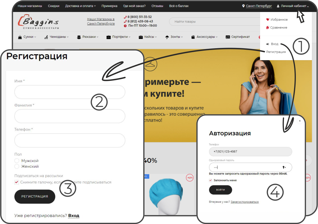 Если Вы уже покупали у нас на сайте, нажмите ВХОД, далее введите Ваш телефон и код из СМС. Нажмите ВОЙТИ и Вы попадете в Личный кабинет.