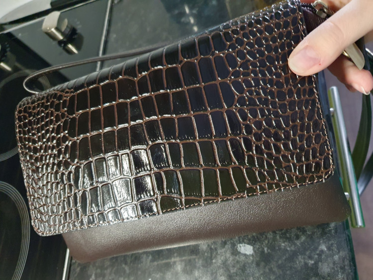 Красивый контраст с основной кожей цвета шоколада создает лаковая отделочная кожа – под рептилию в тон основной коже.