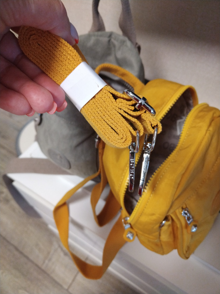 Переносится с помощью короткой ручки и двух регулируемых рюкзачных лямок. Так же в комплект входит съемный регулируемый ремень, который можно прикрепить к рюкзаку, и носить его уже в качестве небольшой сумочки.