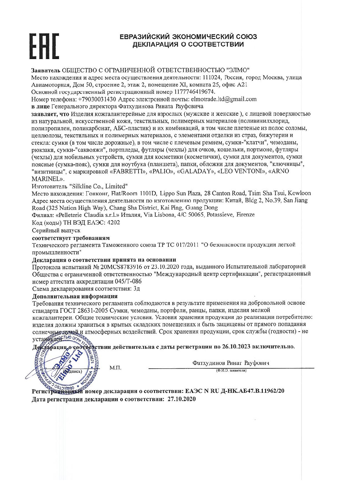 Сертификат соответствия Fabretti