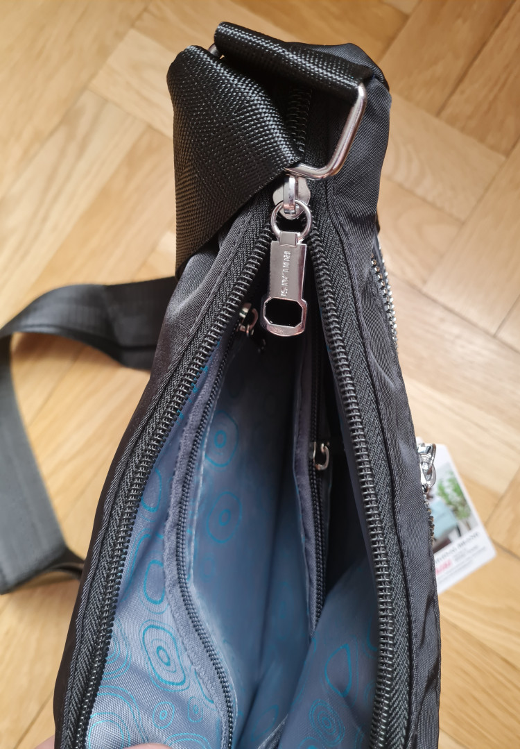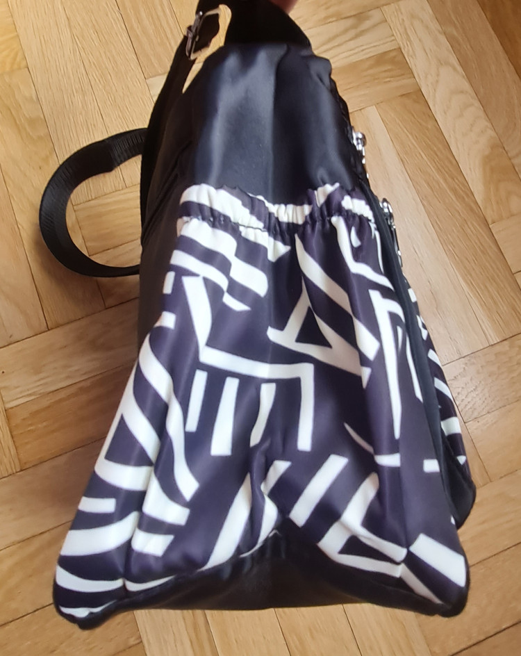 Ткань моющаяся, не промокаемая. Много карманов и кармашков, закрываемых на молнию. Снаружи два кармана "на резинке" - можно положить небольшой зонт или бутылку. Регулируемый широкий ремень.