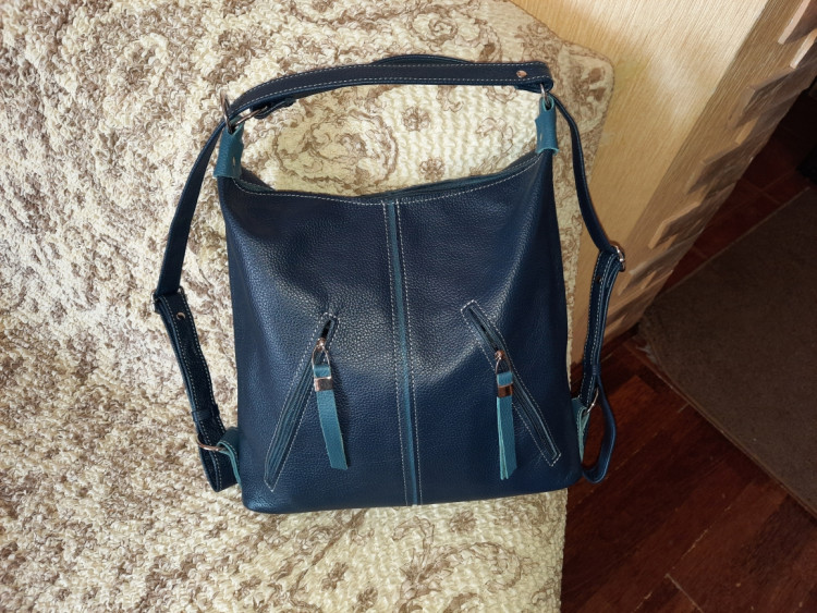 Организацией продажи довольна, все в порядке: оформление заказа, доставка, отслеживание. Сумка довольно вместительная и функциональная, лямки перестегивать не надо, чтобы превратить ее в рюкзак. Цвет красивый, кожа натуральная, много кармашков, строчки ровные, прошиты контрастными нитками. Отделение одно, но внутри есть пара карманов для документов на молниях и два открытых кармашка для телефонов или мелочей (правда для крупных смартфонов кармашки маловаты). Несколько узковатый "вход" в сумку, пластиковый конверт для документов А4, если ставить вертикально, то молния не закроется, а если его внутри сумки перевернуть вдоль, то вполне себе помещается. В общем и целом покупкой довольна. Думаю, буду покупать еще.