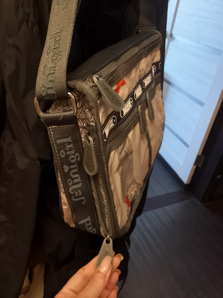 Очень хорошая и качественная сумочка. А рисунок просто класс.Много отделений. Внутри есть ещё и мини косметичка, в нее помещается паспорт. В сумку можно и зонт положить, и документы формата А4 в сложенном виде, и обед на работу. Так же одно отделение расширяется. Покупаю уже вторую сумочку, есть ещё и со слонами. Спасибо!