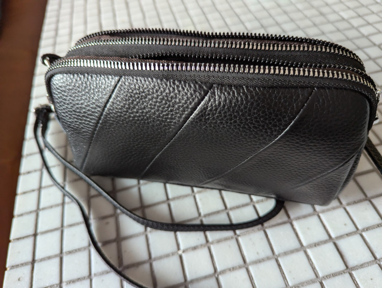 Имеет два отделения с функциональными и удобными карманами для документов и мобильного телефона. Застёгивается на молнию.