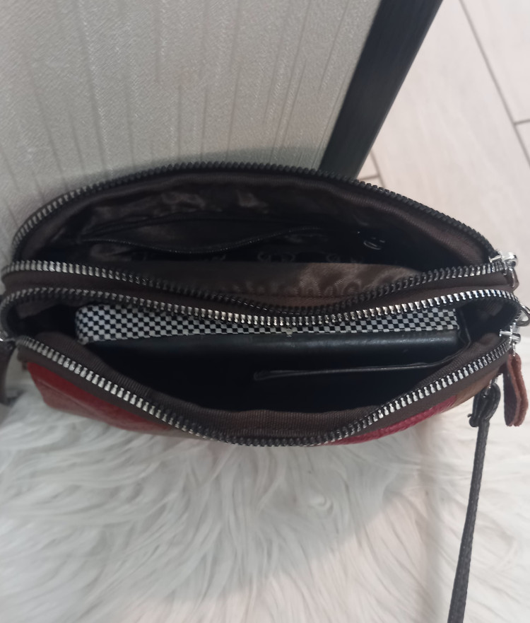 Сумочка очень яркая, разноцветная, кожаная. Подходит как под классический образ, так и под спортивный.Имеет два ремешка. Внутри два отделения, и два кармана. Достаточно вместительная. Очень довольна. Рекомендую. Спасибо, Baggins.