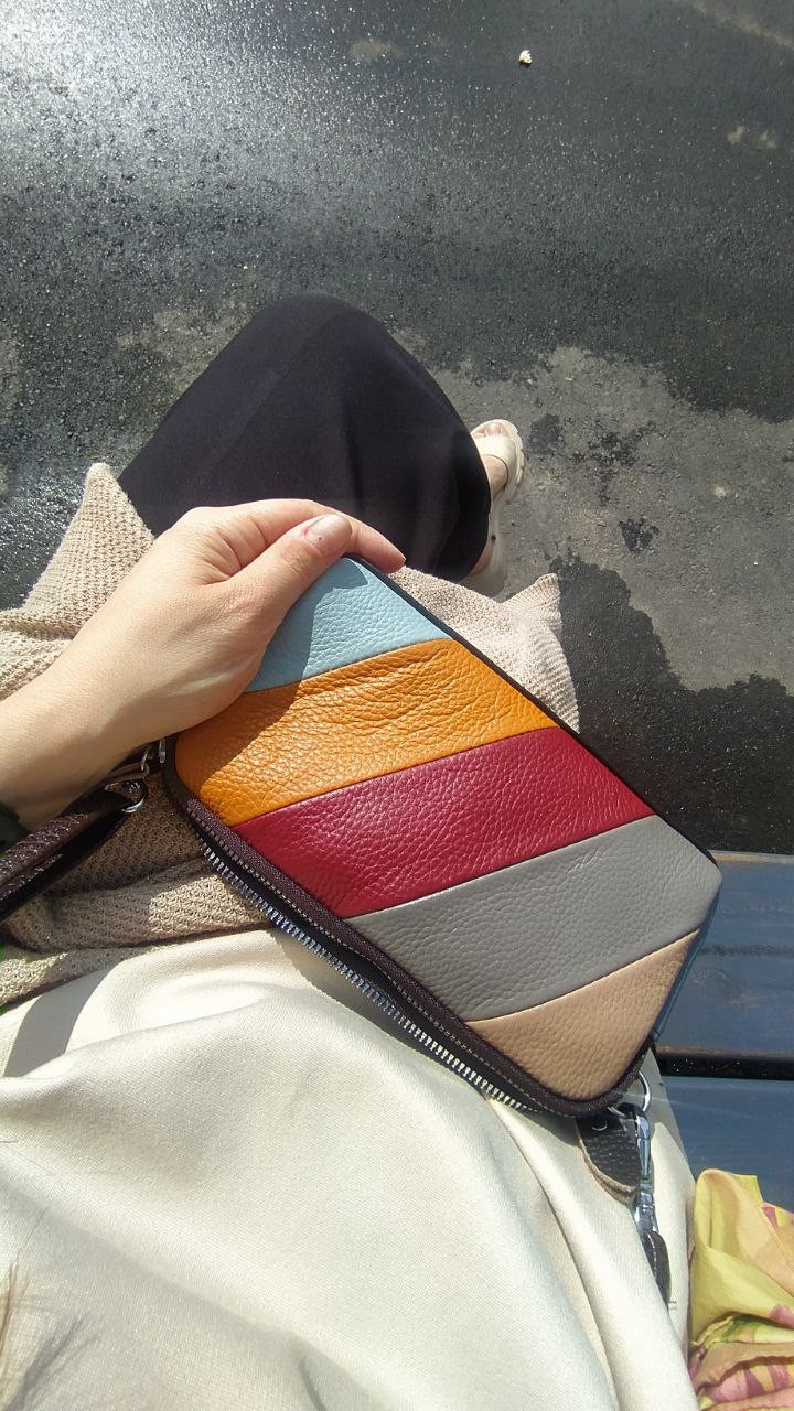 Прекрасна на подарок! Купила уже второй подруге, нравится, что можно надевать со всеми вещами, т.к. разнообразие цветов. Кожа чувствуется - на ощупь, на запах. Смартфон спокойно помещается, два отсека внутри, плюс еще 2 маленькх кармашка - один на замочке, другой открытый - для мелочей, карт и др.