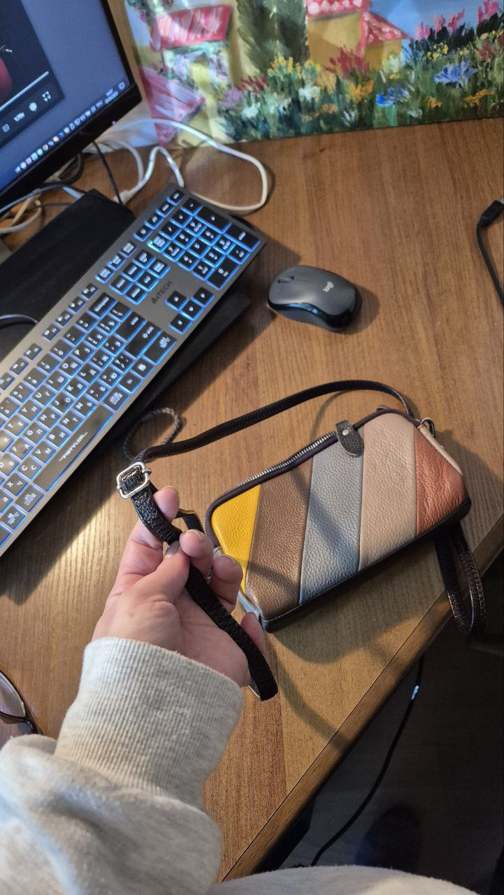 Сумочка выполнена из натуральной зернистой кожи из разноцветных полосок, есть длинный ремешок и ремешок "на руку". Имеет два отделения на молнии, внутри кармашек на молнии и кармашек без молнии. Выполнена качественно, хорошая подкладка. Сумочка вмещает все необходимое, несмотря на свои миниатюрные размеры. Покупкой очень довольна, спасибо Baggins!