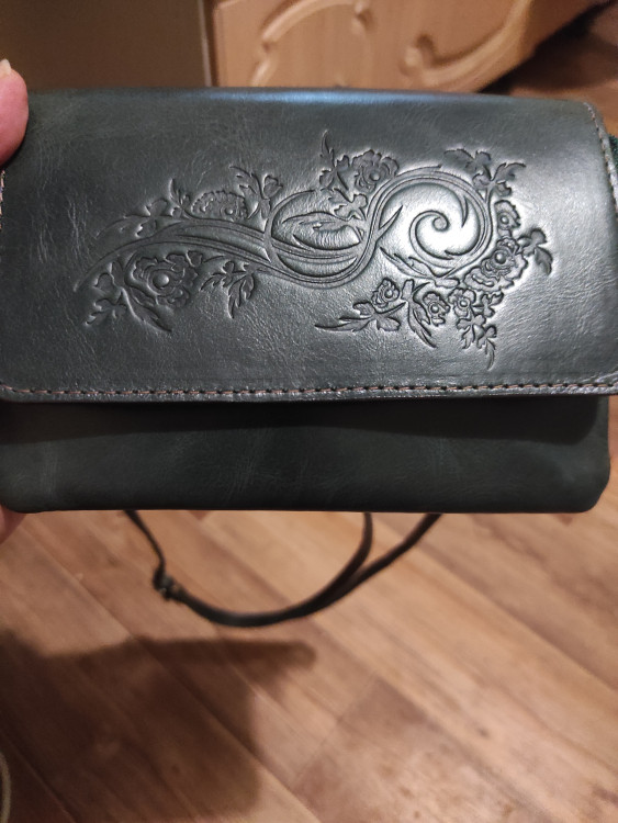 Миниатюрная элегантная кожаная сумочка «Ким» - сшита из гладкой кожи красивого зеленого цвета. Это прочная, плотная кожа с эффектом винтажности, которая при эксплуатации становится только лучше, так как время оставляет свой налет на этом материале, как бы полирует его. Индивидуальность изделию придает рисунок на зеленом фоне кожи.