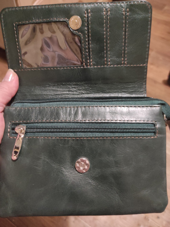 Женская сумочка-кошелек темнозеленого цвета.